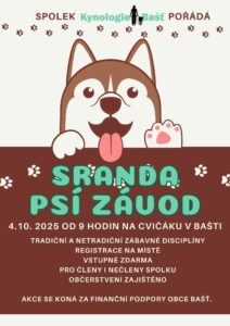 Kynologie Bašť zve všechny majitelé pejsků na sranda psí závody v sobotu 4. 10. 2025 od 9 hodin na cvičáku v Bašti. Registrace bude probíhat
